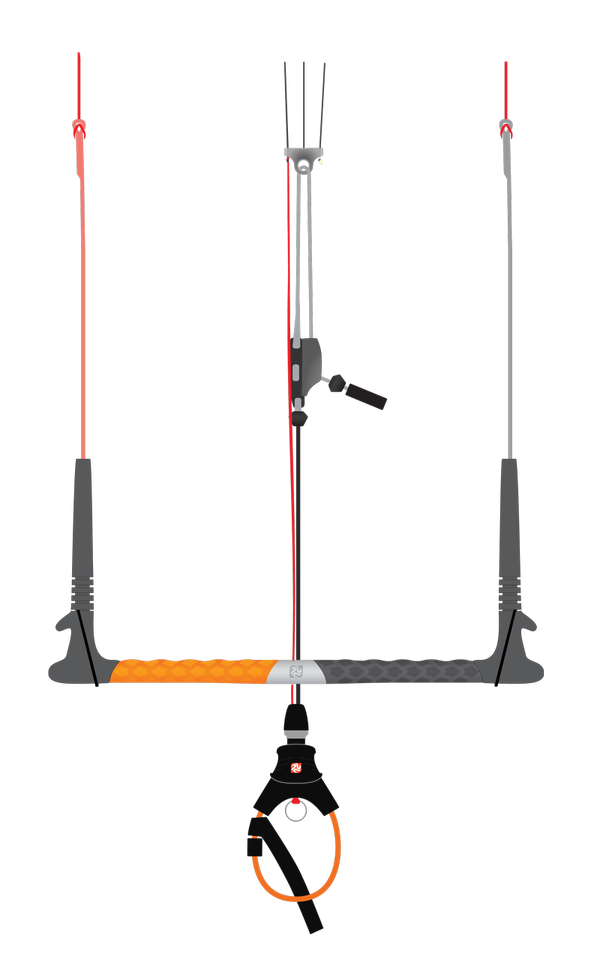 De kite komt met de Navigator V6 bar met 22m lijnen, deze bar heeft een medium harde grip. We kunnen de bar zo afstellen dat hij ook geschikt is voor kortere armen, zoals voor de jonge talenten en de dames!